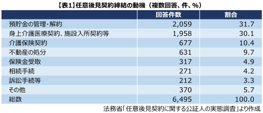 上記調査結果から、任意後見契約を締結した動機をまとめると、表1のとおりです 。
